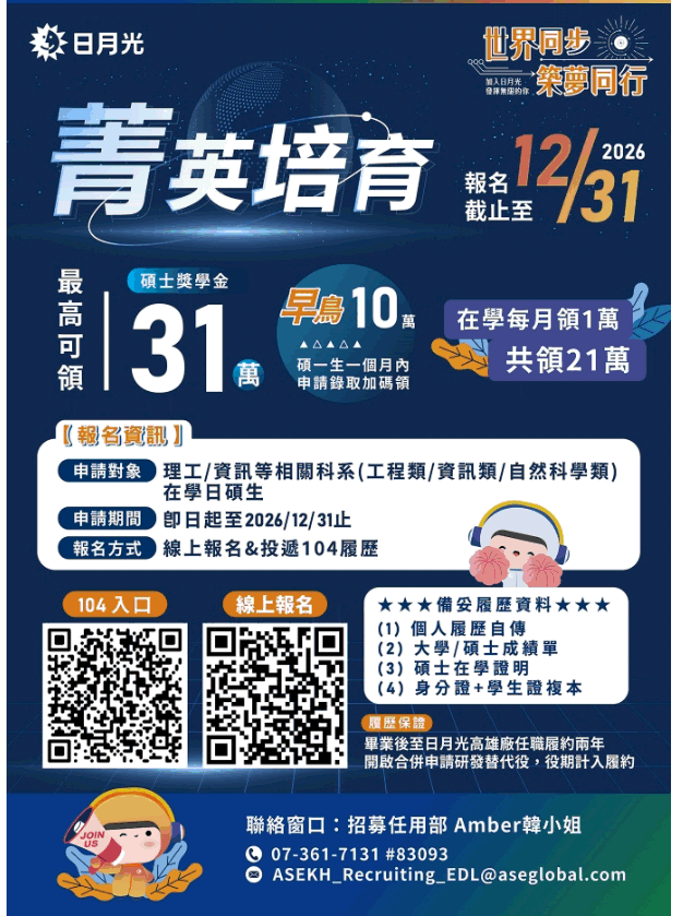 日月光半導體(ASE)推出 「2026 菁英培育獎學金計畫」,旨在培育半導體領域的優秀碩士人才。